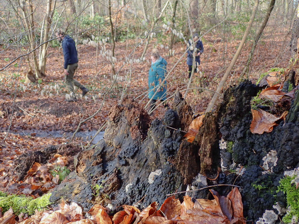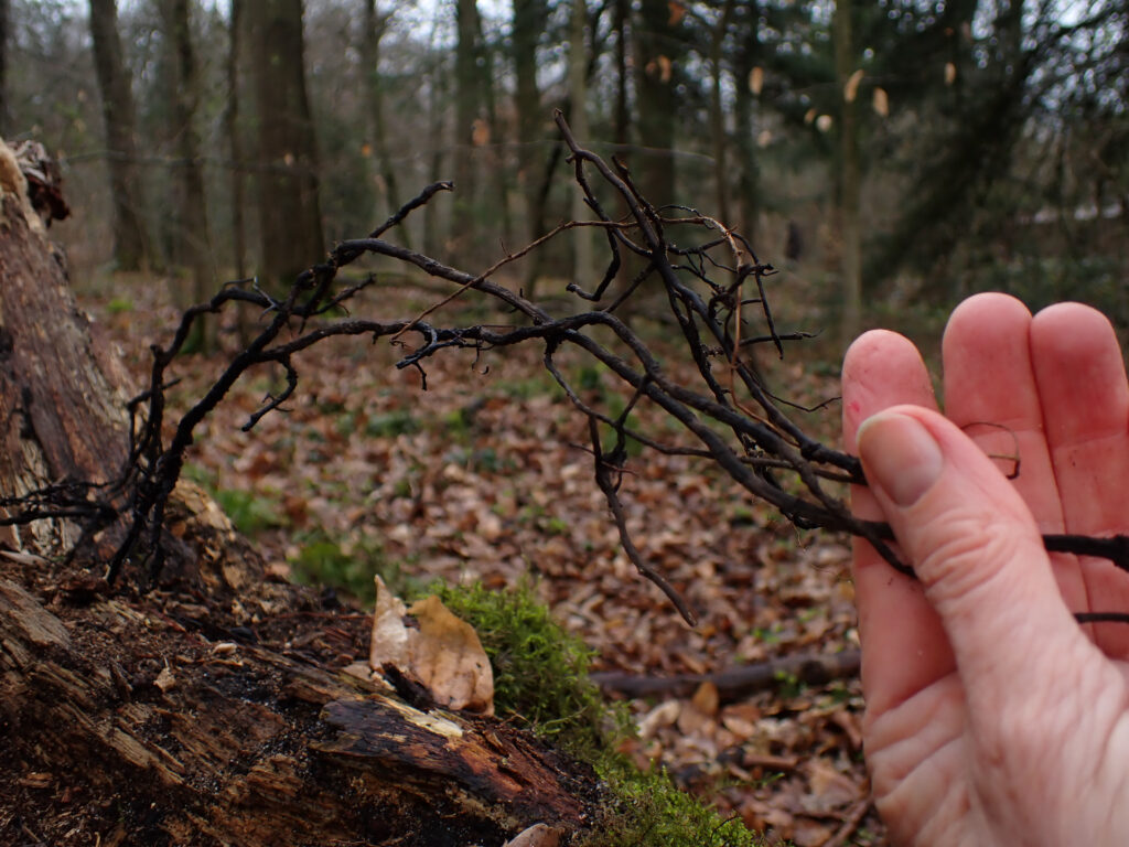 Auch ohne üppige Fruchtkörper bietet das Frühjahr eine faszinierende Welt voller Entdeckungen. Das Lebewesen Pilz ist nahezu überall präsent – verborgen als feines Myzel im Laub, durchziehend in morschen Baumstümpfen oder sichtbar in charakteristischen Mustern im Holz. Besonders eindrucksvoll sind die netzartigen Strukturen (Rhizomorphen) des Hallimasch. Auch Weiß- und Braunfäule begegnen uns: Das weißfaule Holz ist durch die Arbeit verschiedener Pilzarten so weich geworden, dass sich daraus kleine „Weißfäulebällchen“ formen lassen. Wir entdecken auch Baumpilze, die wir mit Feuerzeug und Lauge näher untersuchen. Während der Rotrandige Baumschwamm beim Erhitzen Blasen wirft, ist dies bei der Kruste des Zunderschwammes nicht der Fall. Bei ihm verfärbt sie sich mit Lauge rotbraun. Der Fenchelporling verrät sich sofort durch seinen intensiven, charakteristischen Duft. Diese und unsere weiteren Funde sind mit einigen Fotos beim NABU/naturgucker eingetragen.