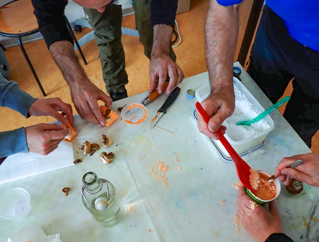 Am Nachmittag stellen wir Pilzmodelle her, indem wir Zucht-Champignons mit Alginat und Gips abformen. Wer sich diese nicht selber herstellen möchte bekommt bei Thomas Müller auch sehr schöne wetterfeste aus Keramik.