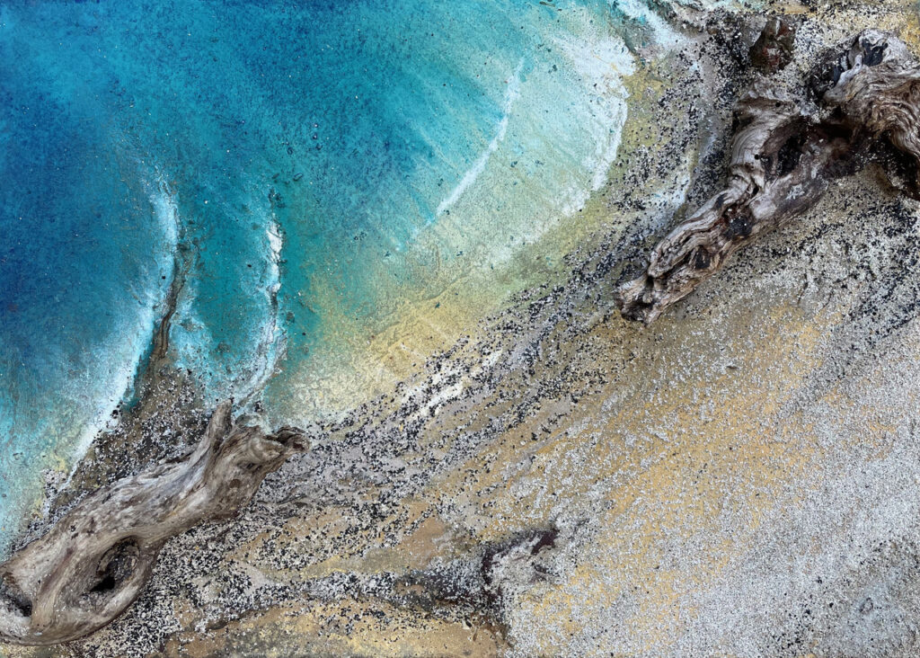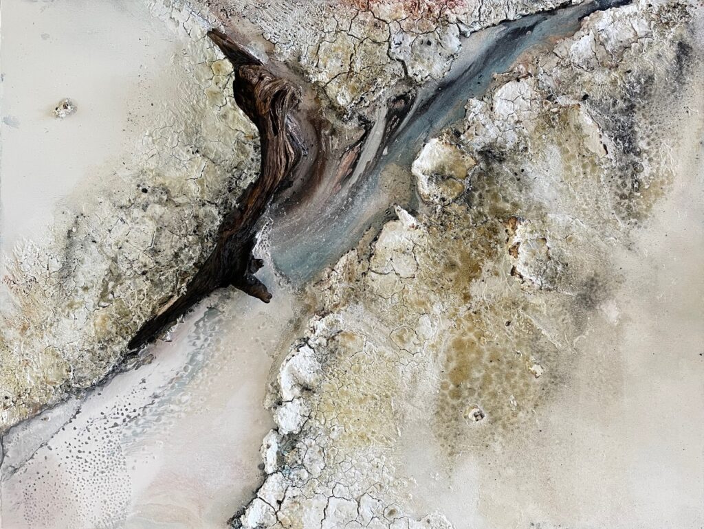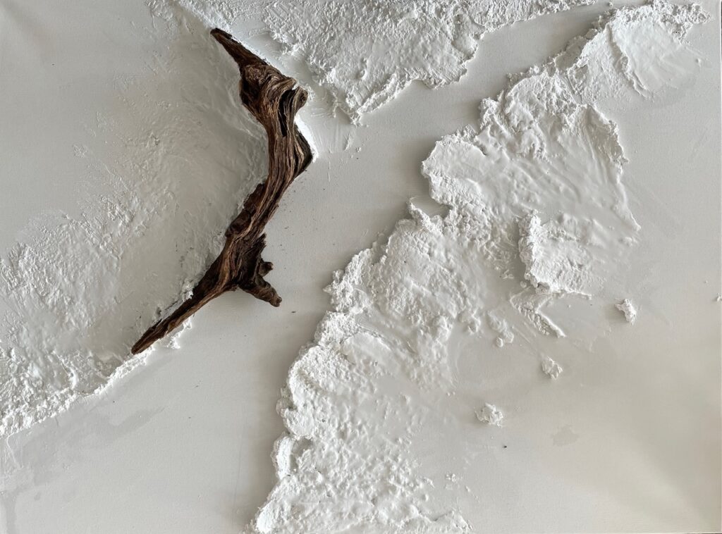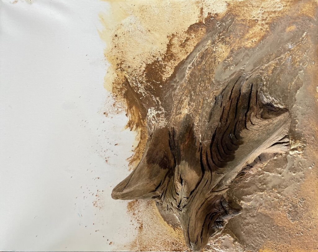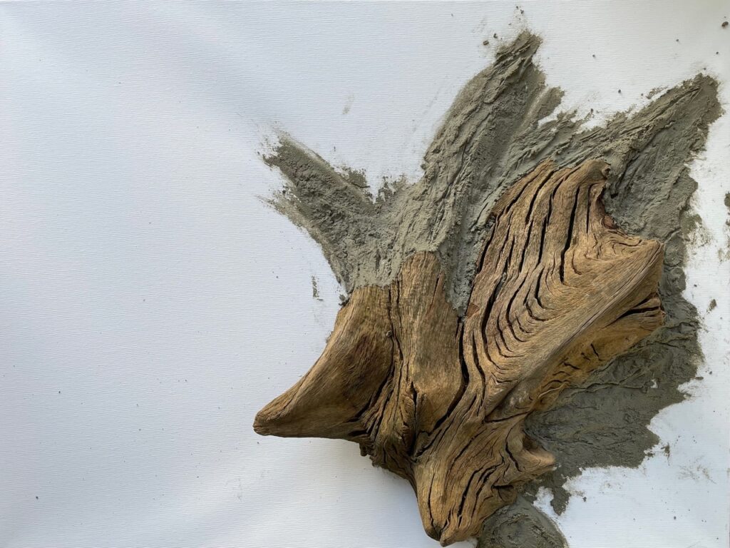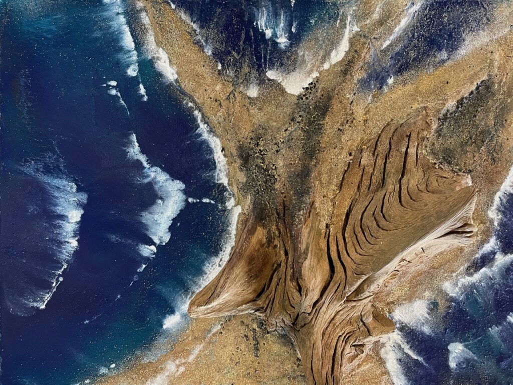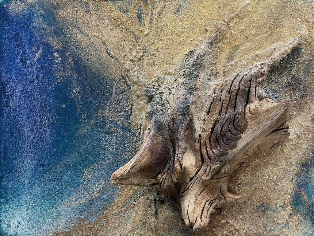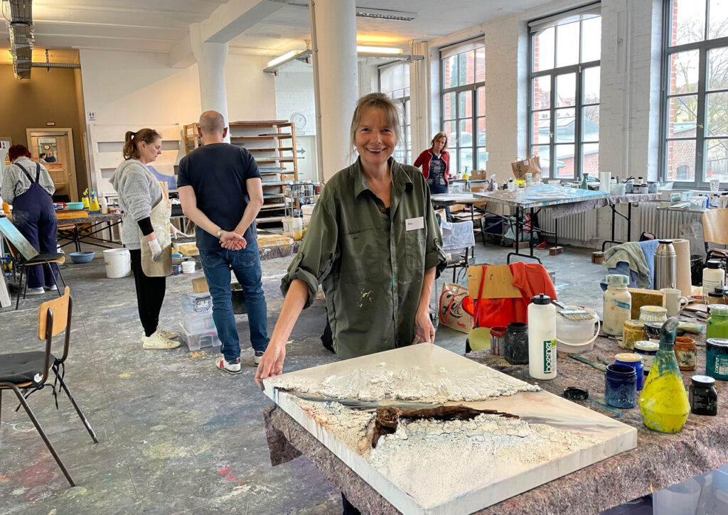 Unter der inspirierenden und motivierenden Anleitung von Carsten Westphal entstehen abstrakte Werke, die an ursprüngliche Landschaften erinnern. Zu Beginn legen wir ein dreidimensionales Relief an. Mit Sand, Marmormehl oder Fliesenkleber – oder einer Mischung aus allem – entsteht die Basis unserer Bilder. Ich experimentiere zusätzlich und arbeite Wurzelstücke, Rinden und Strandfunde in mein Bild ein. Es fühlt sich an, als würde ich ein Stück Natur direkt ins Bild holen.