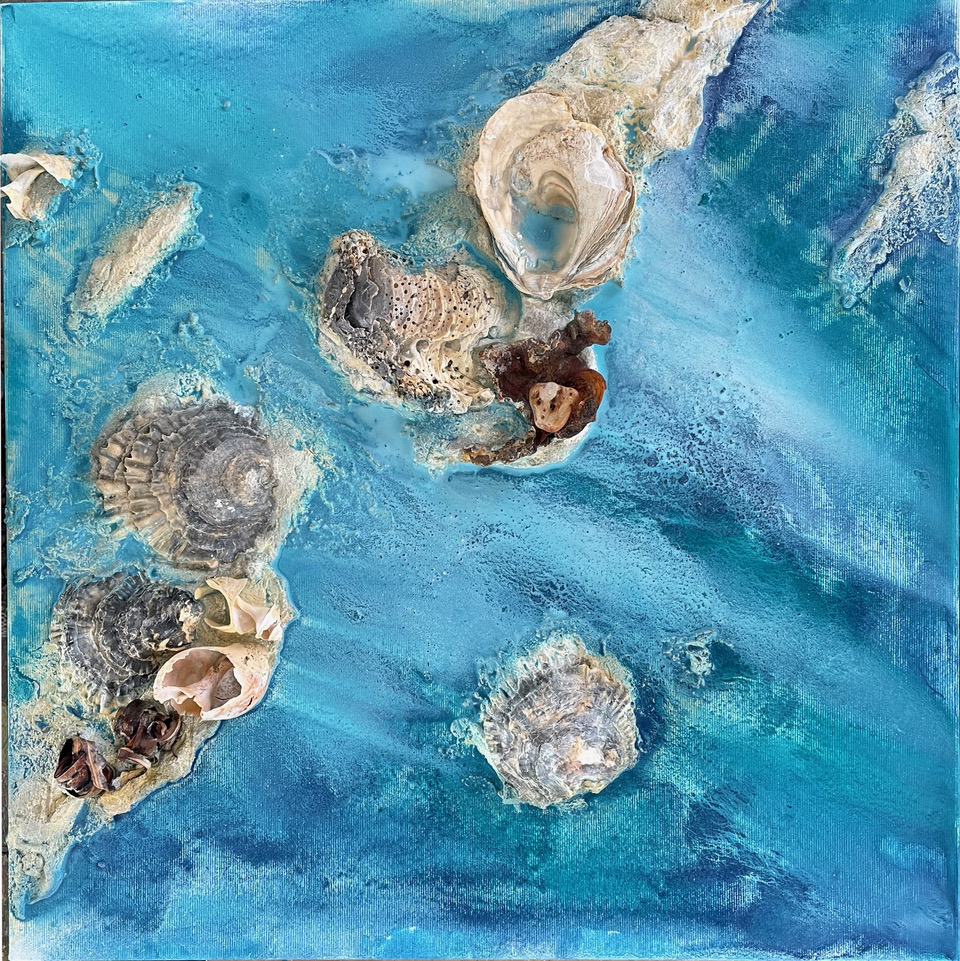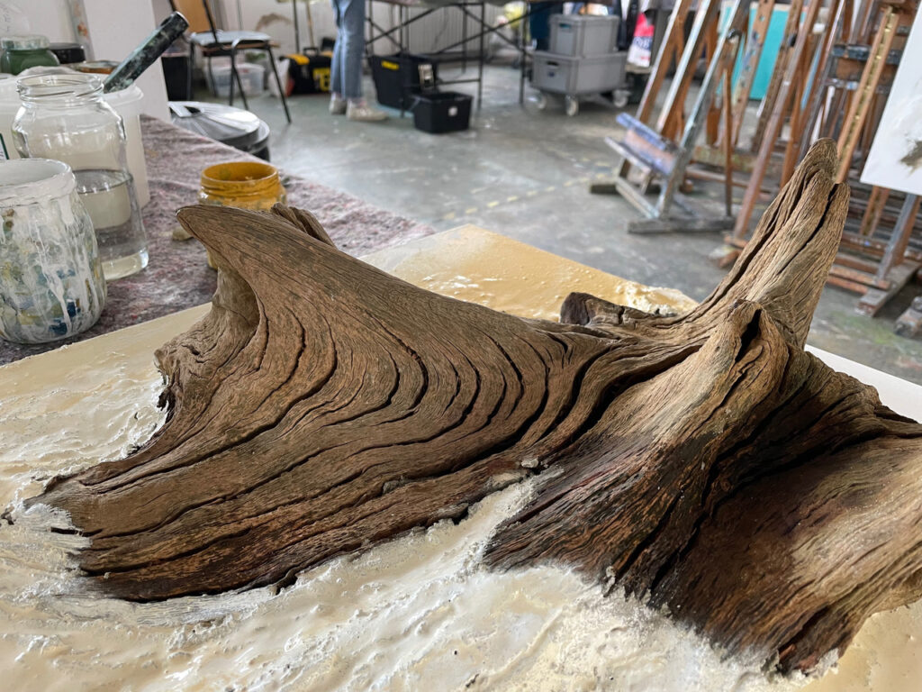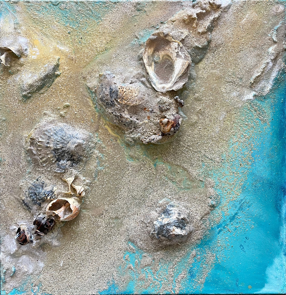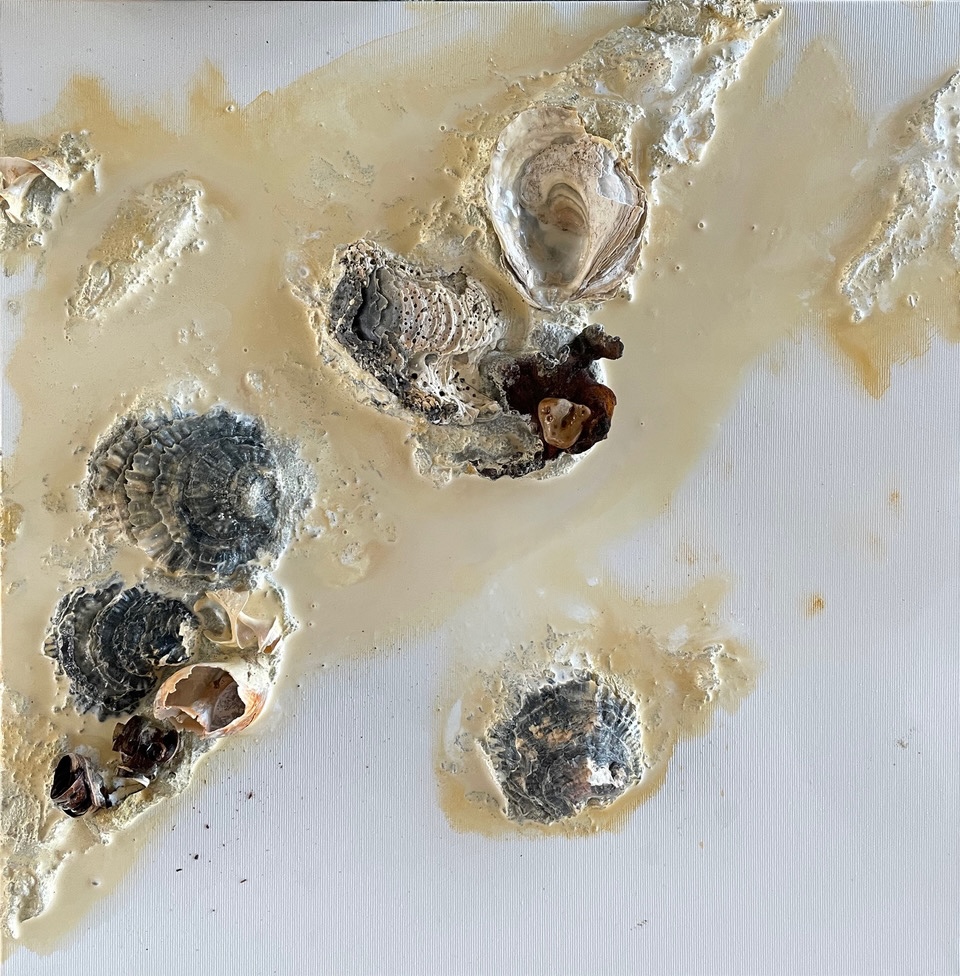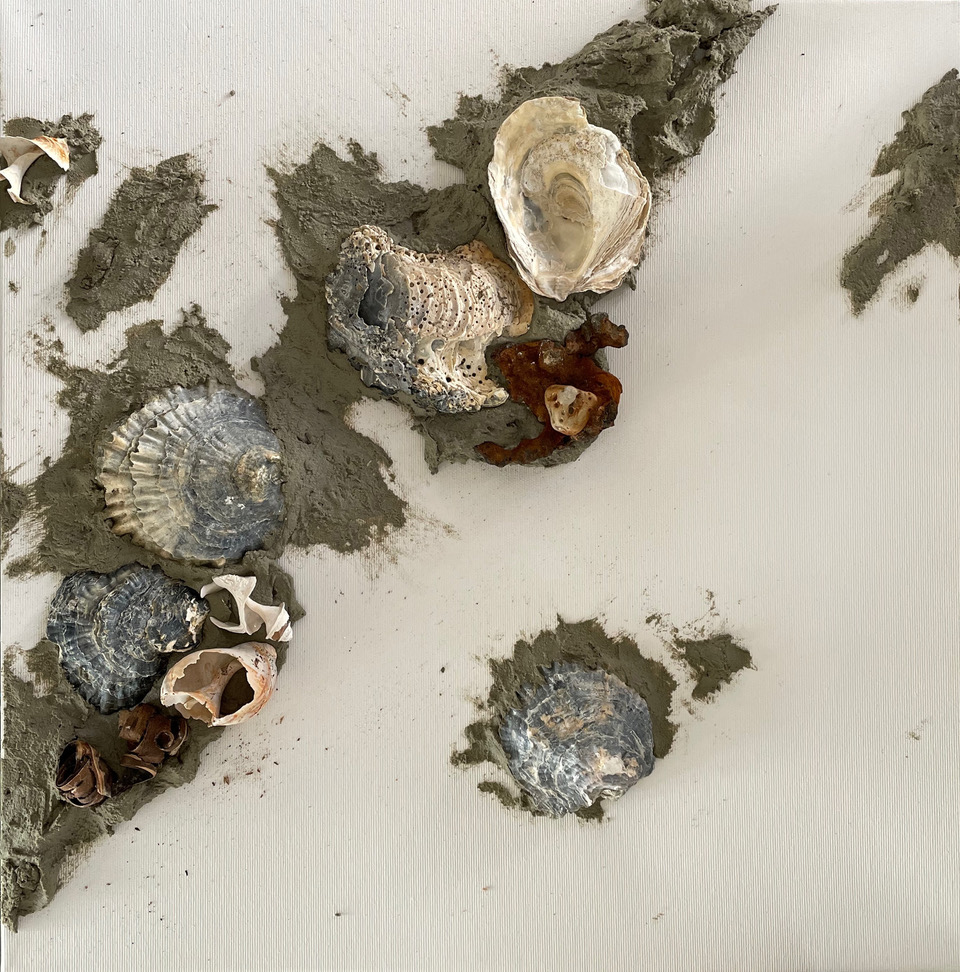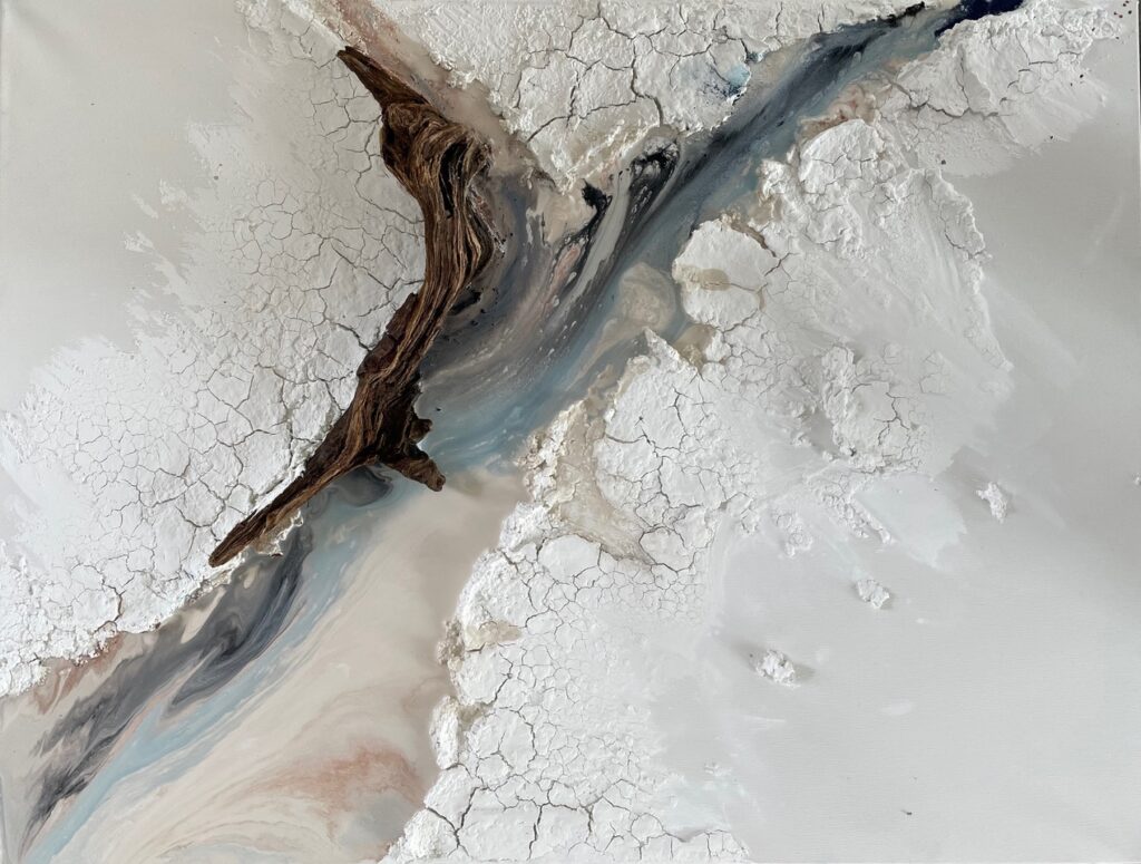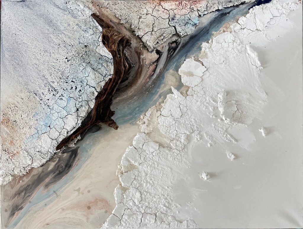 Unter der inspirierenden und motivierenden Anleitung von Carsten Westphal entstehen abstrakte Werke, die an ursprüngliche Landschaften erinnern. Zu Beginn legen wir ein dreidimensionales Relief an. Mit Sand, Marmormehl oder Fliesenkleber – oder einer Mischung aus allem – entsteht die Basis unserer Bilder. Ich experimentiere zusätzlich und arbeite Wurzelstücke, Rinden und Strandfunde in mein Bild ein. Es fühlt sich an, als würde ich ein Stück Natur direkt ins Bild holen.