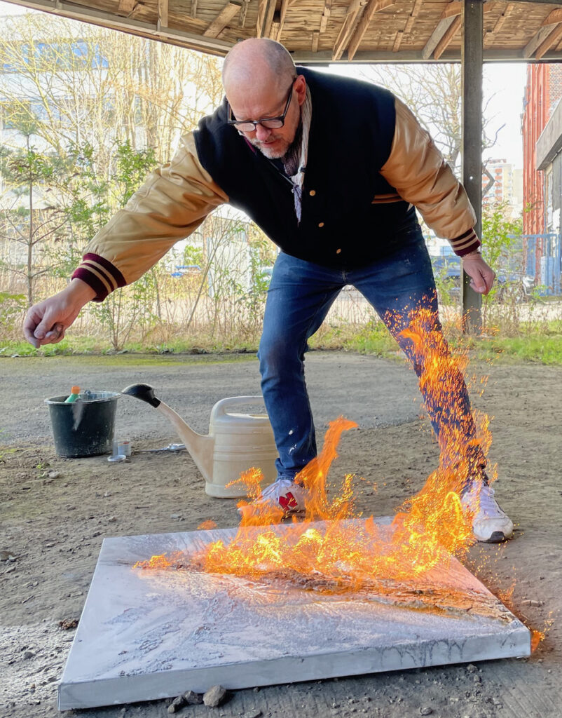 Besonders beeindruckend ist das Arbeiten mit Feuer. Beim Abfackeln der Bilder entstehen durch Schellack, Holzkohle und Eisenspäne faszinierende, unvorhersehbare Strukturen. Hier wird der Prozess noch unmittelbarer – kraftvoll und transformierend.