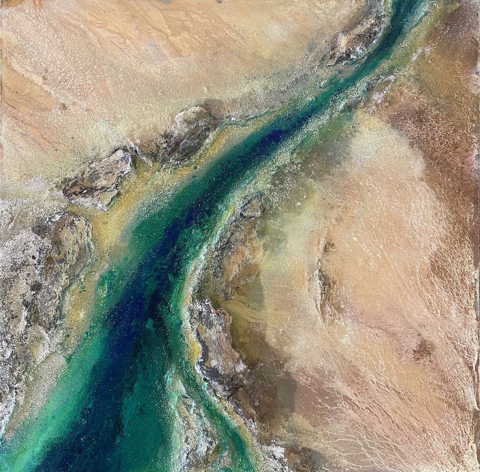 Schicht für Schicht entwickelt sich das Werk weiter. Farbe, Wasser und Pigmente verbinden sich, verlaufen, trocknen, verändern sich. Schnell wird klar: Ein Bild lässt sich nicht erzwingen. Es gibt Phasen, in denen es unfertig, chaotisch oder einfach „nicht schön“ wirkt. Je nach Mischung und Bewegung der Farben entstehen immer neue Effekte. Ich lerne, loszulassen, zu vertrauen und den Prozess zu genießen, statt ein fertiges Ergebnis erzwingen zu wollen. Der Weg ist das Ziel.