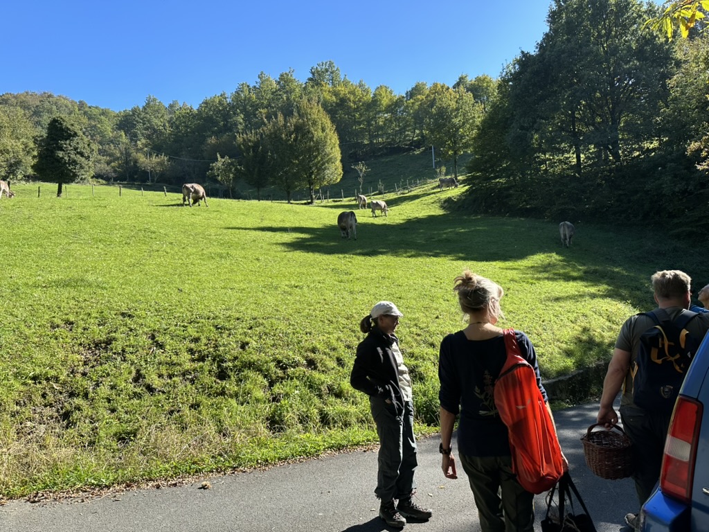 Anschließend geht es nach Taglieto „in die Pilze“. Hier entdecken wir gleich zu Beginn in einem Eschenwäldchen einige besondere Saftlingsarten, die bei uns sehr selten zu finden sind. An einem kleinen Bach gibt es ein gemütliches Picknick bevor wir die Runde durch Wald und Wiesen beenden. Auf dem Rückweg begegnen wir dem Landwirt, von dessen Kühen unsere Milch stammt. Auch hier sind unsere Funde und weitere Fotos beim NABU/naturgucker zu finden. Abends gibt es dank Annemaries und Angelikas Kochbegeisterung handgefertigte Nudeln und Croxetti.