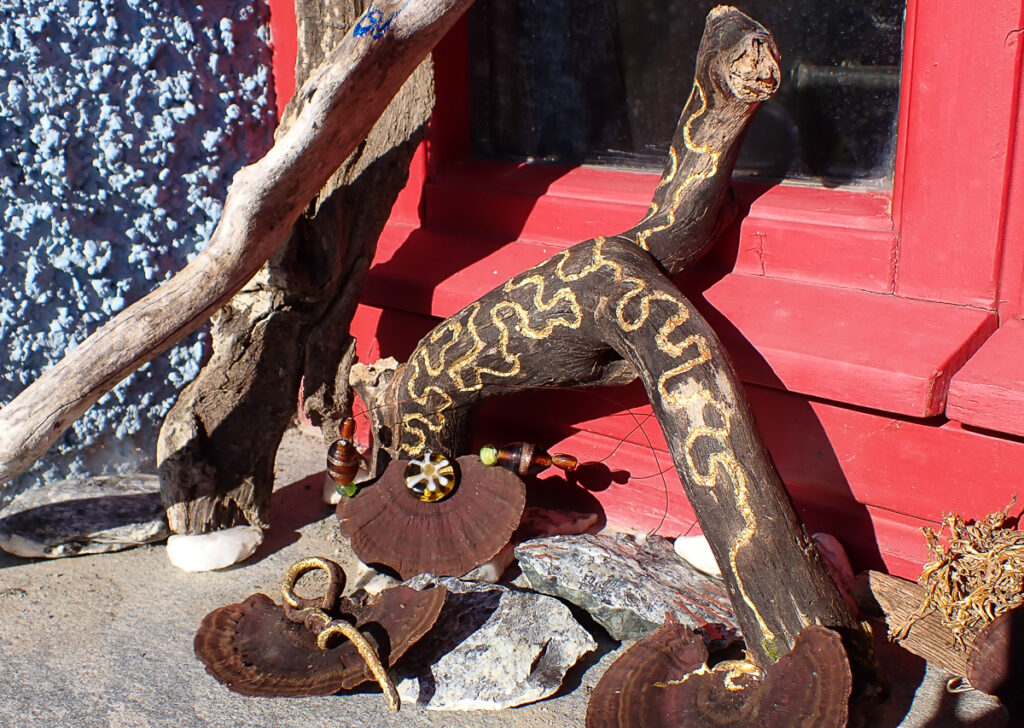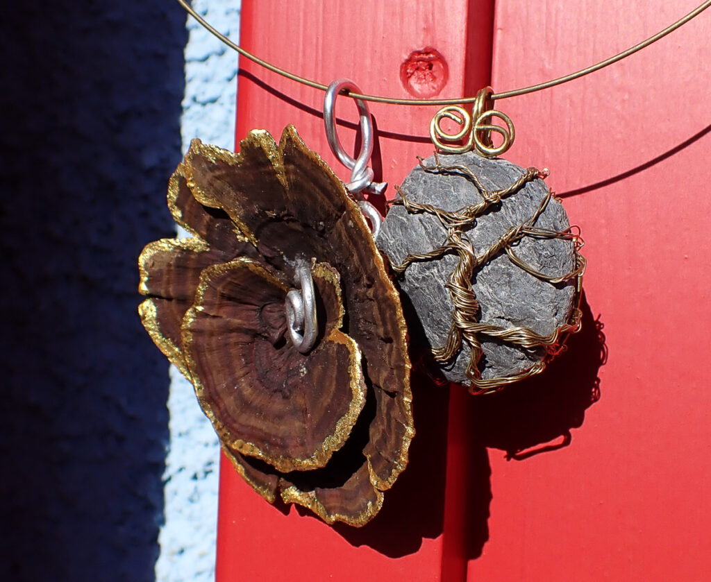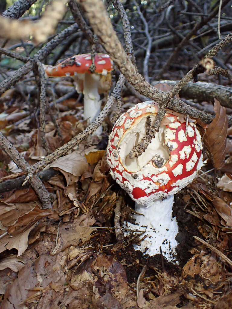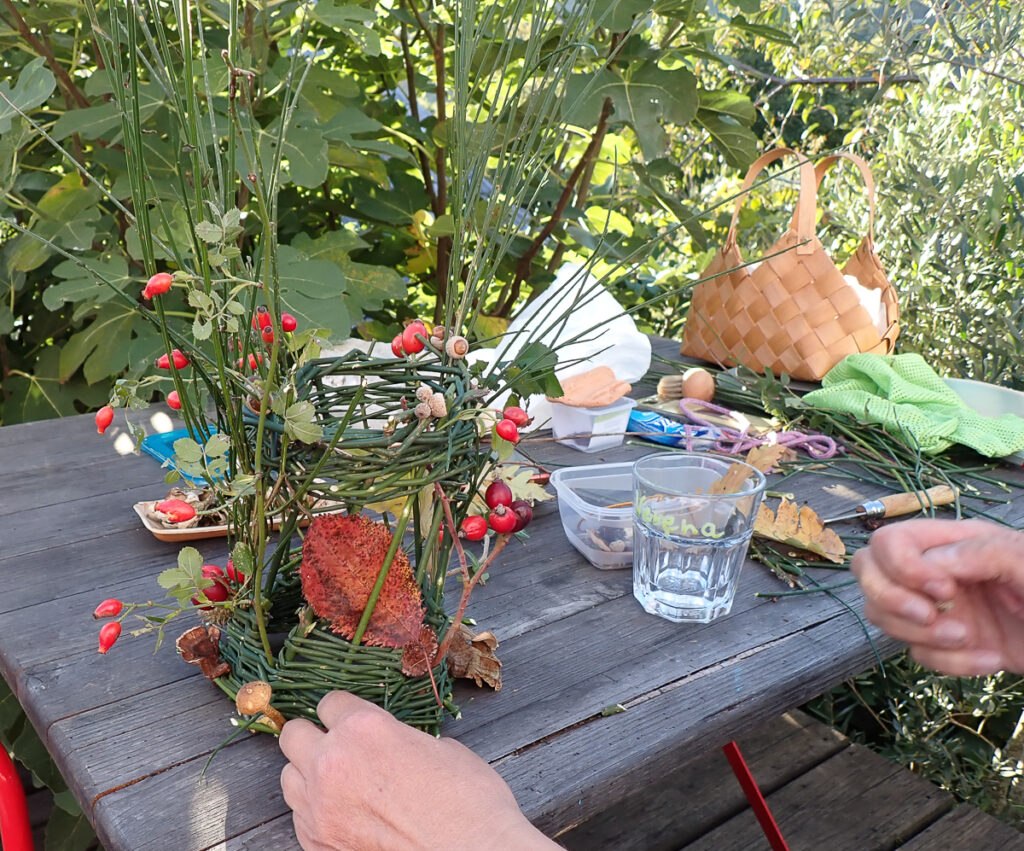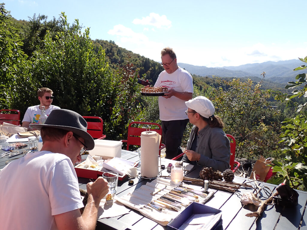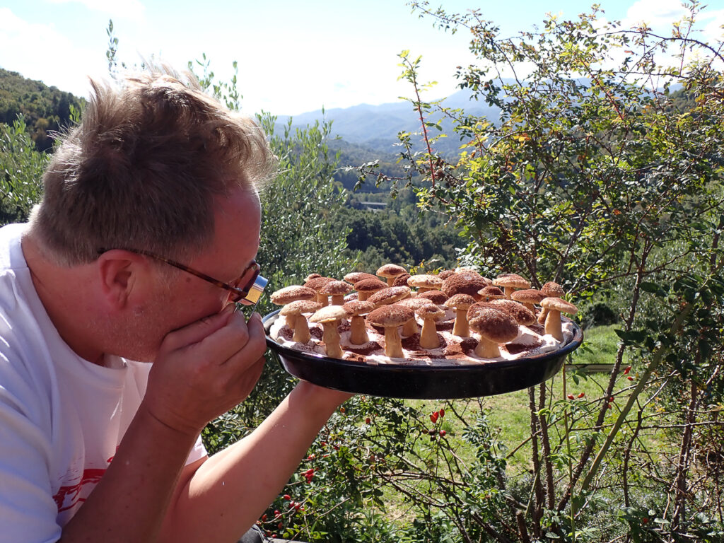 An diesem Tag geht es kreativ zu – aus Pilzen, Steinen, Stöcken und allem was die Natur an hübschen Mustern und Farben zu bieten hat, gestalten wir Schmuck und Deko. Zur Stärkung gibt es eine Pilztorte aus kunstvoll gefertigten Pilzen von Annemarie und Angelika aus Esskastanienmousse zum Kaffee. Für Peter gibt es eine Lupe, mit der er diese Exemplare erst einmal nachbestimmen muss. Abends grillen wir im Trullo und lassen den Tag am Feuer gemütlich ausklingen.