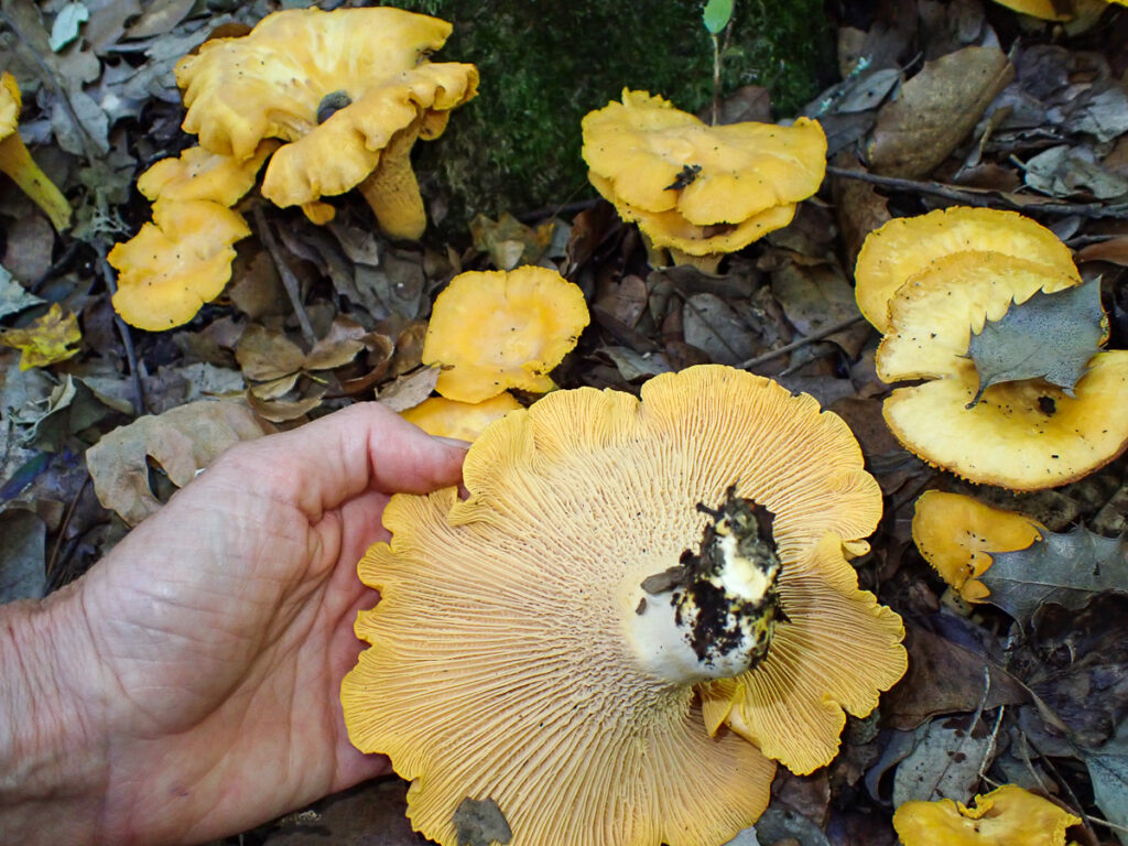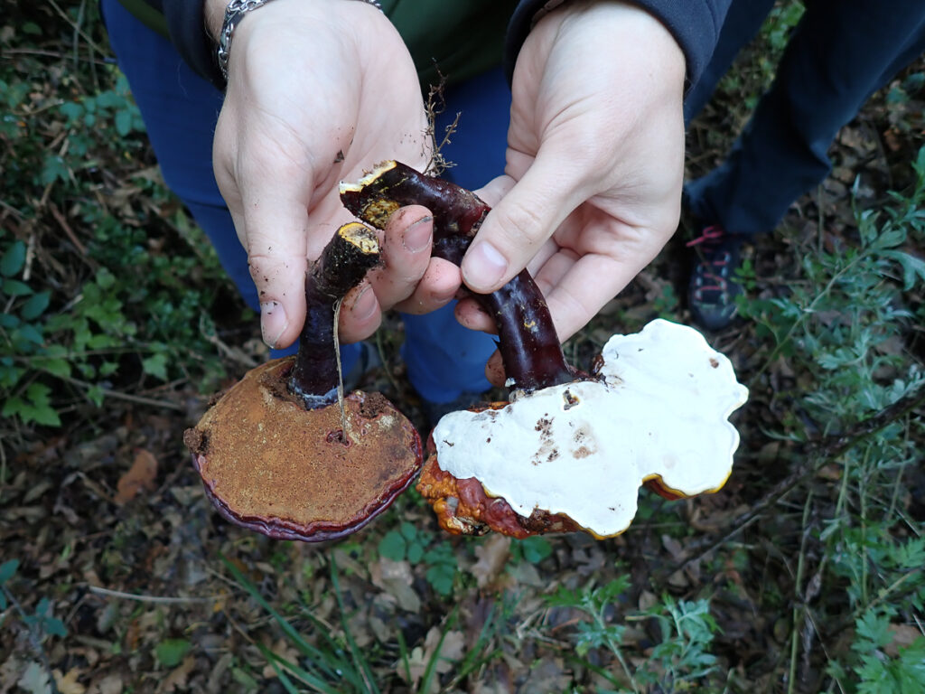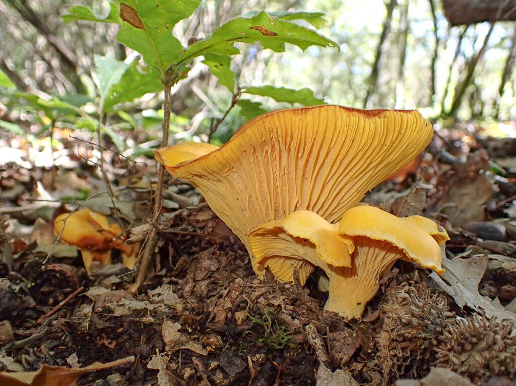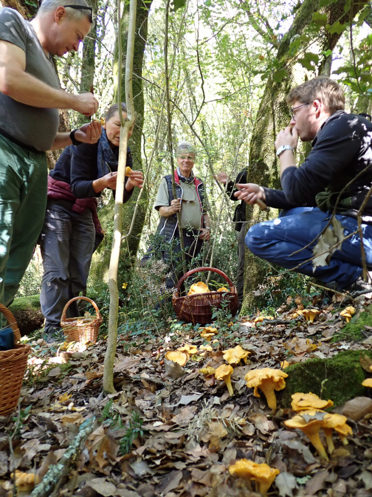 Am Freitag geht es vormittags in einen Steineichenwald bei Salterana. Gleich zu Beginn finden wir Glänzende Lackporlinge, die in der Vitalpilzkunde Reishi genannt werden. Doch das Highlight des Tages ist neben den Korkstacheingen eine Fundstelle mit vielen und ungewöhnlich großen Pfifferlingen. Auch von diesem Gebiet gibt es eine Fundliste beim NABU/naturgucker mit weiteren Bildern.