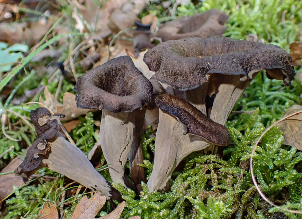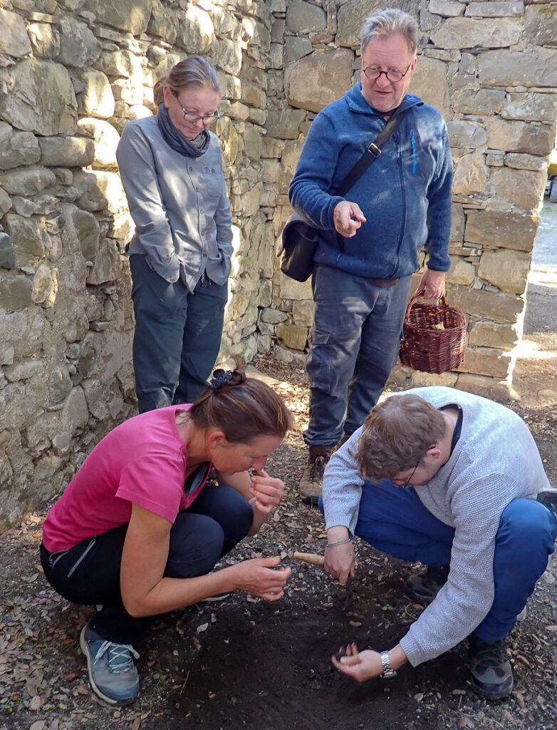 Wir entdecken bei unserer Wanderung nach Porciorasco viele Pilzarten. Ein ganz besonderes Highlight ist der Fund des Pilz des Jahres, die Amethystfarbene Wiesenkoralle. Beeindruckend sind auch die vielen Totentrompeten die wir zum Trockenen auslegen und als Nudelsauce genießen. Von den Ölbaumtrichterlingen schauen wir uns im Stockdunklen die leuchtenden Lamellen an. Unsere Funde sowie weitere Fotos sind beim NABU/Naturgucker eingestellt. Dank Sockes (Arnolds Hund) Spürnase für Trüffeln bereiten wir getrüffelte Eier mit Sommer-Trüffeln vor, die es zum Frühstück geben wird.