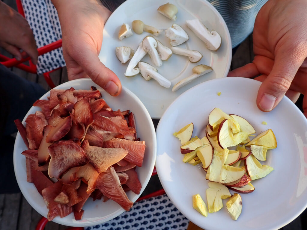 Am Sonntag machen wir einen ersten Spaziergang zur Stora. Hier gibt es bereits einige spannende Pilzarten zu entdecken, wie Königs-Röhrling und Ochsenzunge. Unsere Funde sind mit einigen Fotos beim NABU/Naturgucker dokumentiert. Die gefundenen Pfifferlinge genießen wir am Abend lecker zubereitet mit regionalen Produkten und Gemüse aus dem eigenen Garten von Annemarie und Peter. Angelika brät uns einzelne Kostproben von Ochsenzunge, Königs-Röhrling und den gefundenen Schnecklingen.
