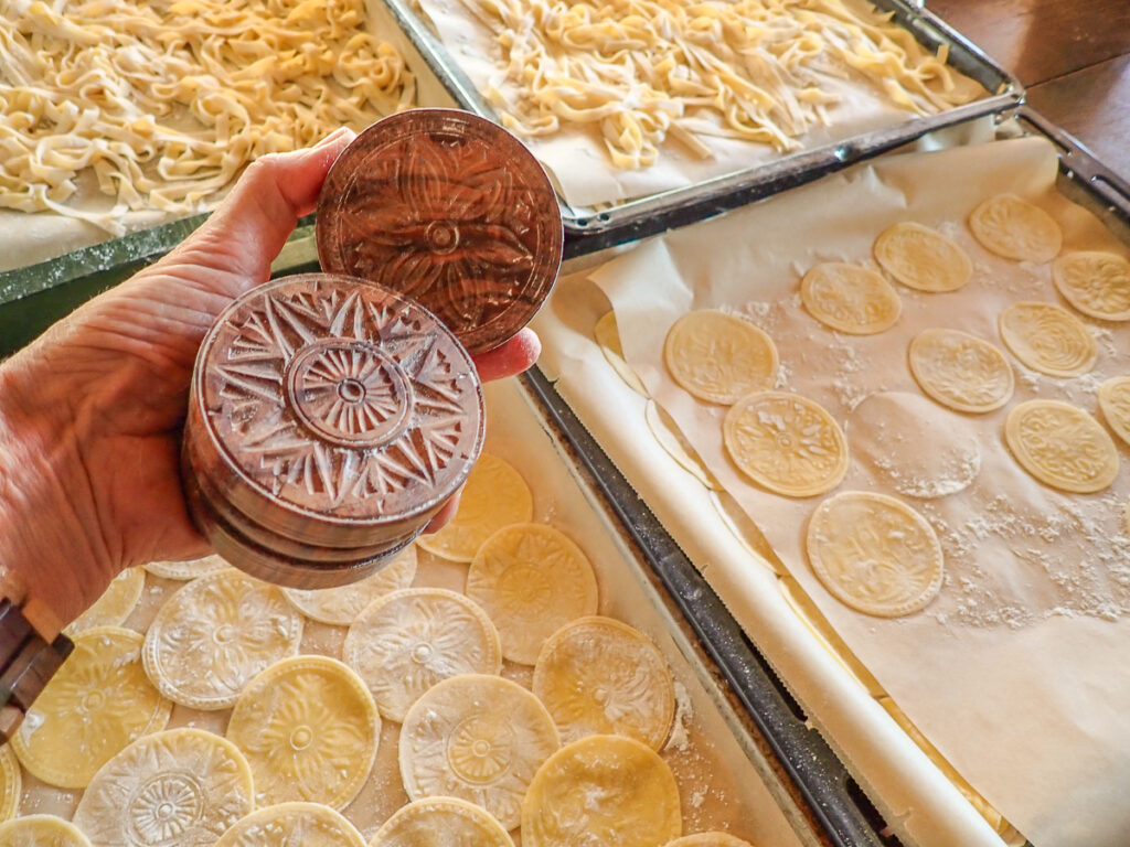 Die Eier, die gestern zusammen den der Sommer-Trüffel zum Aromatisieren „eingesperrt“ wurden, gibt es nun als Spiegeleier zum Frühstück – und derart gestärkt brechen in das kleinen Städtchen Varese Ligure auf. In einem kleinen Handwerksbetrieb bekommen wir die traditionelle Herstellung von Stempeln für Croxetti gezeigt. Früher bereiteten zahlreiche Familien ihre Nudeln mit eigenem Familienwappen zu.